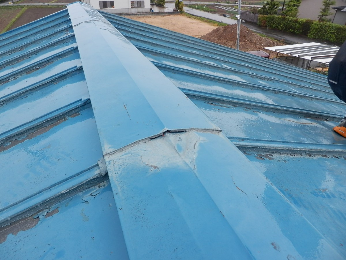【鉄板屋根の塗装前】 錆びて塗装も全体的に剥がれてしまっている状態でした。