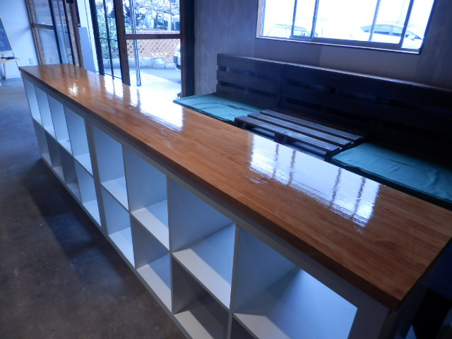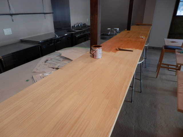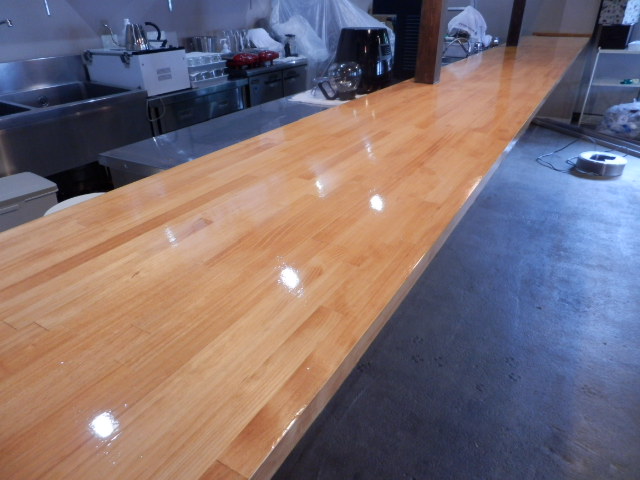 飲食店の新設カウンターを素地から色付けとクリアー塗装しました。