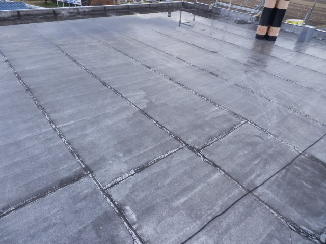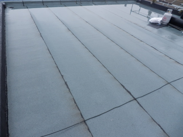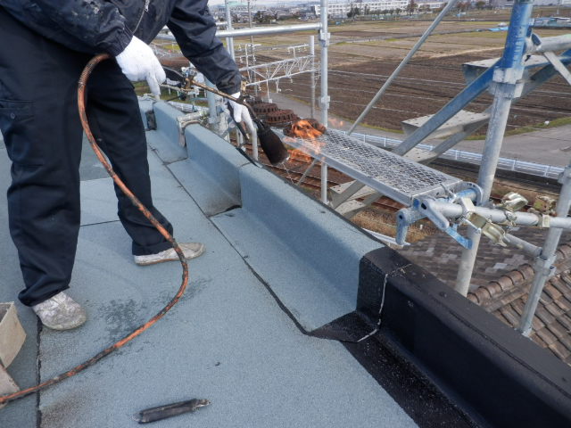 下地がアスファルト防水ということで施主様の希望で同じ仕様で施工致しました、アスファルトシートをバーナーで炙って溶かしながら張り込む工法です、防水性能も高いので当分安心して頂けると思います。